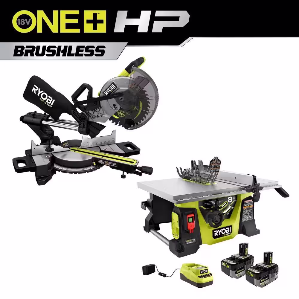 RYOBI ONE+ HP 18V Brushless Cordless 2-Tool Combo Kit with Table Saw, Miter Saw, (2) 4.0 Ah Batteries, and Charger