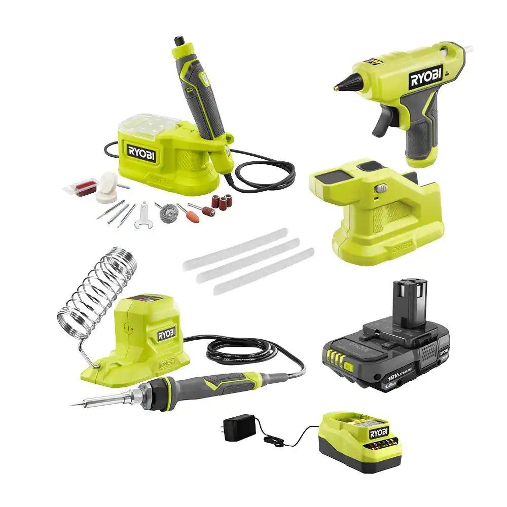 RYOBI ONE+ 18V Cordless 3-Tool Hobby Kit with Compact Glue Gun, Soldering Iron, Rotary Tool, 1.5 Ah Battery, and Charger