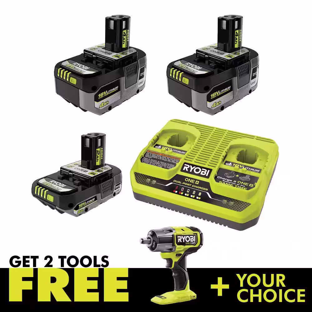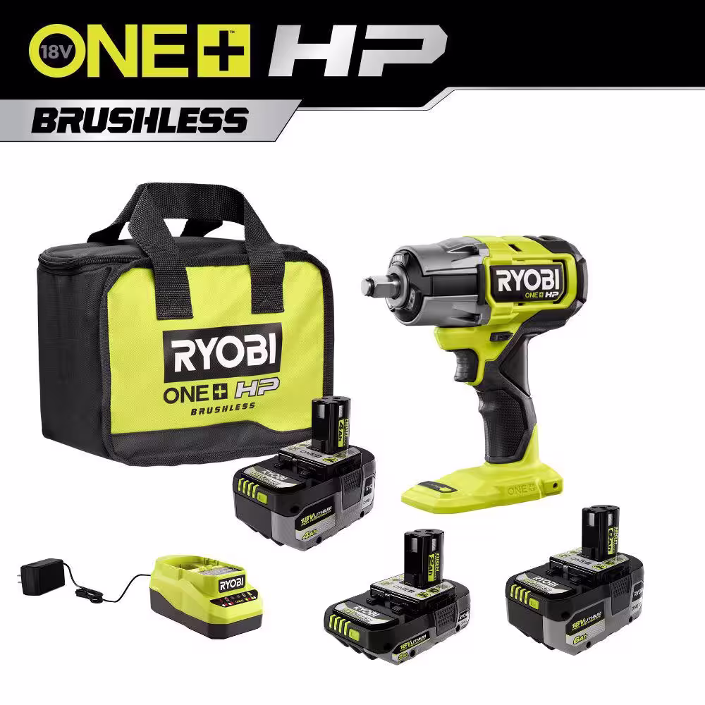 RYOBI ONE+ 18V HIGH PERFORMANCE Kit w/ (2) 4.0 Ah Batteries, 2.0 Ah Battery, 2-Port Charger, & ONE+ HP Brushless Impact Wrench