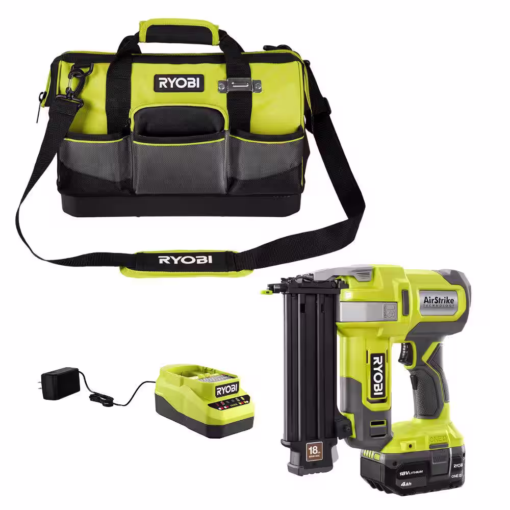 RYOBI ONE+ 18V 18-Gauge Cordless AirStrike Brad Nailer with 4.0 Ah Battery, Charger, and 16 in. Tool Bag