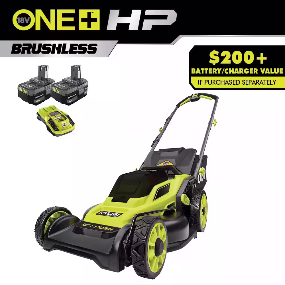 RYOBI ONE+ HP 18V Brushless 16 in. Cordless Battery Walk Behind Push Lawn Mower with (2) 4.0 Ah Batteries and (1) Charger