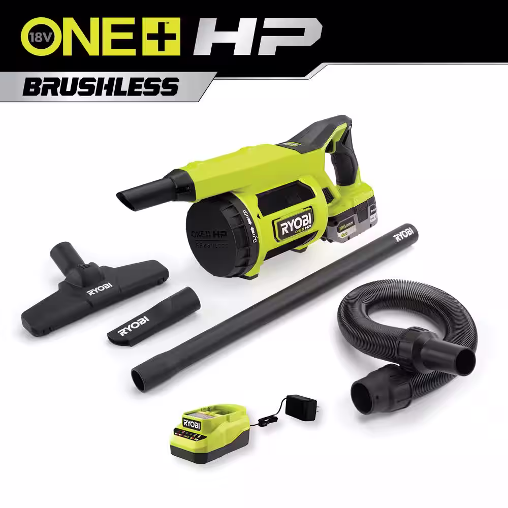 RYOBI ONE+ HP 18V Brushless Cordless Jobsite Hand Vacuum Kit with 4.0 Ah HIGH PERFORMANCE Battery and 18V Charger