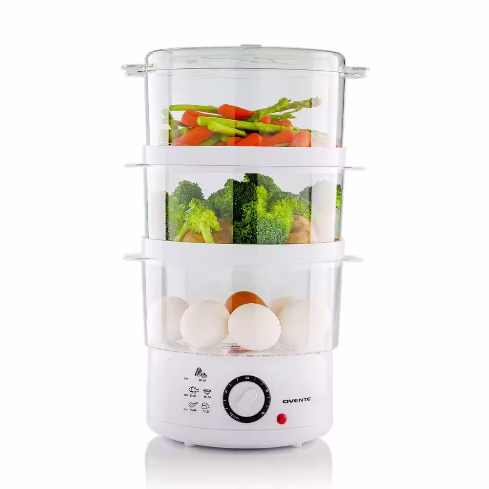 OVENTE 3-Tier Electric Steamer for Vegetables and Food with Timer, 7.5-Quart, 400-Watts, Auto Shut-Off Feature, White (FS53W)