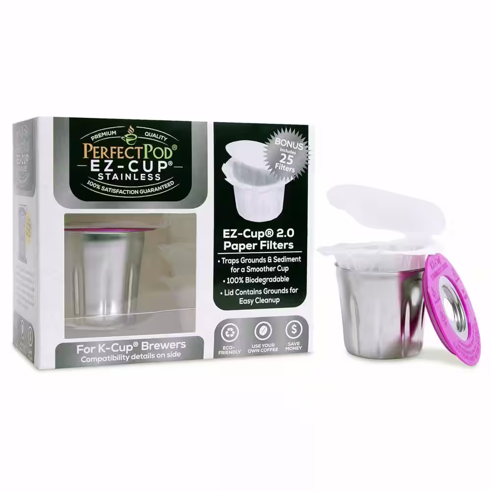 PERFECT POD EZ-Cup Stainless Steel Reusable K Cup Coffee Pod + 25 Disposable Paper Filters compatible with Keurig 1.0,2.0 & Others
